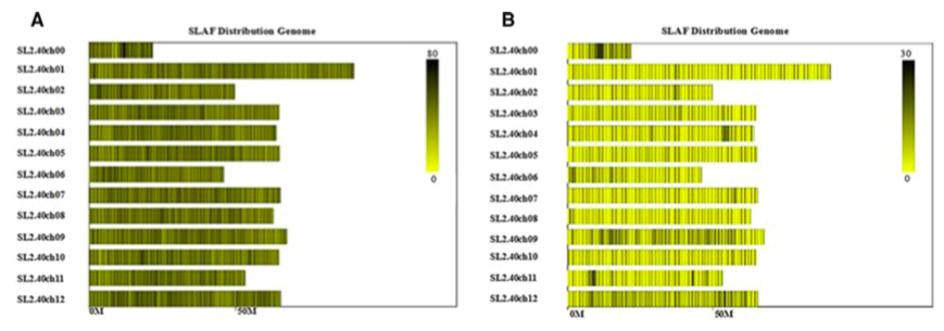 圖3 SLAF標(biāo)簽分布圖(A)和多態(tài)性SLAF標(biāo)簽分布圖(B)