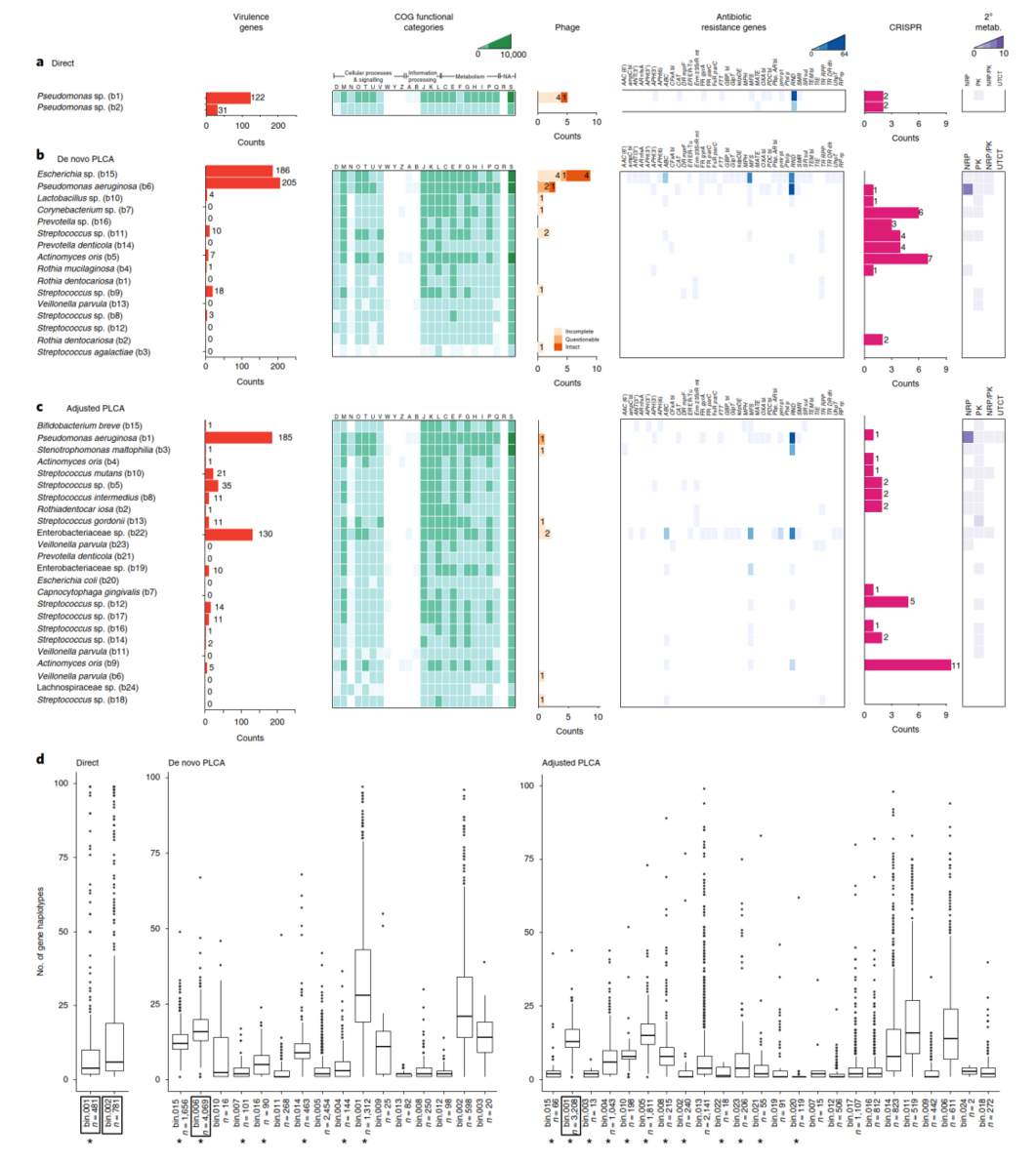通過富集培養(yǎng)獲得的分類學多樣性的增加直接轉(zhuǎn)化為該微生物群落功能信息的增加(圖6)。富集培養(yǎng)測序在直系同源蛋白簇(COGs)、毒力基因、抗生素抗性基因、CRISPRs和次級代謝功能方面獲得更大的多樣性和功能鑒定數(shù)量。先前的研究已經(jīng)證實囊性纖維化氣道以及整個人類微生物群中存在單一物種的異質(zhì)性群體。作者通過鑒定基因單倍型來計算每個宏基因組bin的遺傳變異性(圖6d)。在一些宏基因組bins中,作者鑒定到一個一致的和少量的基因單倍型,表示這個bin代表一個單一的基因組群體(即一個菌株)。在大多數(shù)bins中,作者觀察到大量的單倍型多樣性,指示異質(zhì)性群體,即多菌株。不出所料,這些區(qū)域中每個基因的單倍型數(shù)量是多種多樣的,這表明細菌基因組內(nèi)進化壓力的已知范圍。平均而言,假單胞菌屬種中鑒定出更多的基因單倍型,富集培養(yǎng)的bins比直接測序更多。然而,直接測序鑒定了大量的普遍存在的單倍型基因離群值。Bin的完整性與平均單倍型頻率沒有相關性。