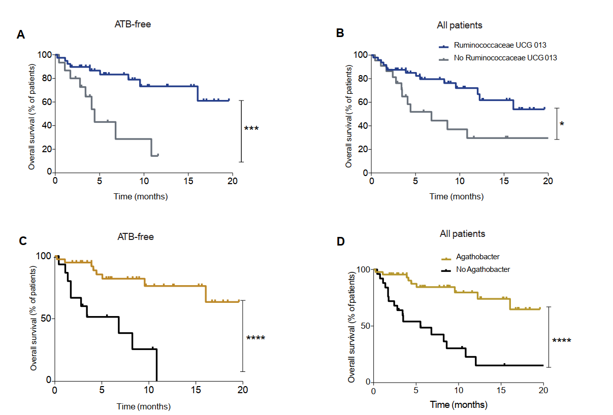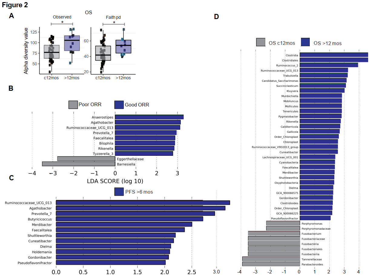由于ATB的使用顯著改變了GM的組成,作者通過排除接受ATB治療的患者來描述GM組成。在無ATB組,alpha多樣性降低與較短的OS有關(guān)(圖2A)。在beta多樣性分析中沒有發(fā)現(xiàn)不同的clusters。Ruminococcaceae UCG 13Agathobacter在具有良好ORR和PFS>6個月的個體中富集(圖2B和2C)。Ruminococcaceae UCG 13在OS>12個月的患者中富集(圖2D)。在未接受ATB治療的患者中,Clostridiales order在OS>12個月的患者中富集(圖2D)。