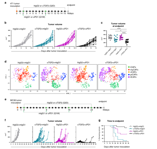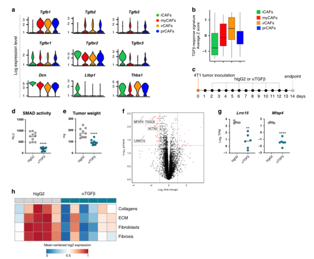綜上所述,這些數(shù)據(jù)促使我們研究TGFβ-阻斷劑在體內(nèi)對CAF表型和功能的相對影響。為此,6周齡雌性小鼠接種4T1腫瘤細(xì)胞,隨后用TGFβ阻斷抗體或同型對照處理,研究設(shè)計(jì)如圖2c所示。結(jié)果表明這種腫瘤進(jìn)展的延遲似乎不是由抗TGFβ對腫瘤細(xì)胞的直接作用引起的,更可能是TGFβ阻斷后微環(huán)境變化的結(jié)果。事實(shí)上,使用TGFβ中和抗體可導(dǎo)致整體基因表達(dá)的顯著差異,這在對大量冷凍腫瘤RNAseq分析中得到證實(shí)(圖2f)。與這些發(fā)現(xiàn)一致的是,我們通過分析與膠原沉積和纖維化相關(guān)的基因特征,描述了抗tgfβ治療小鼠腫瘤中整體促纖維化程序的顯著減少(圖2h)。綜上所述,這些數(shù)據(jù)表明靶向TGFβ影響了腫瘤微環(huán)境中的成纖維細(xì)胞動力學(xué)。