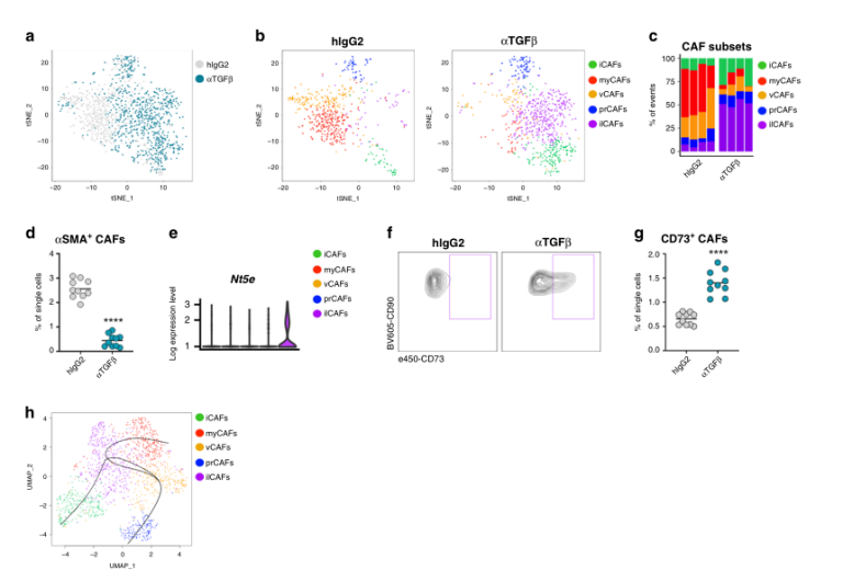 值得注意的是,在TGFβ-阻斷下肌成纖維細(xì)胞的丟失與一種獨(dú)特的CAFs(后來被稱為干擾素許可的CAFs, ilCAFs,圖4b, c為紫色)的出現(xiàn)形成對比,揭示了腫瘤微環(huán)境更廣泛的可塑性。ilCAFs很容易從其他CAF亞群中區(qū)分出來,因?yàn)榕c外切核苷酶Nt5e的基因及編碼的蛋白CD73上調(diào)相關(guān)(圖4f)。