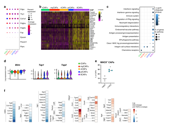 為了獲得關(guān)于新鑒定的CAF亞群功能特性的更多信息,作者研究了這類亞群的轉(zhuǎn)錄特征。然而,對ilCAFs中差異表達(dá)基因分析發(fā)現(xiàn),在干擾素(IFN)信號控制下許多鳥苷晚結(jié)合蛋白(Gbp)家族成員發(fā)生富集(圖5b)。與這些發(fā)現(xiàn)一致的是,在區(qū)分ilCAFs與其他CAF亞群的基因中, ilCAFs中IFN信號反應(yīng)上調(diào),IFN水平調(diào)控的通路增強(qiáng),包括抗原加工和展示(圖5c)。編碼MHC蛋白和MHC相關(guān)分子的基因在ilCAFs中高表達(dá)(圖5b-d)。體內(nèi)TGFβ-阻斷后,在CAFs中檢測到MHCII蛋白上調(diào)(圖5e),也發(fā)現(xiàn)ilCAFs在腫瘤內(nèi)對指導(dǎo)T細(xì)胞的轉(zhuǎn)運(yùn)發(fā)揮重要作用(圖5b)。