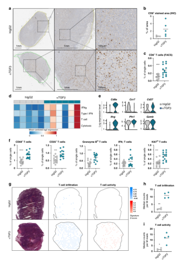 TGFβ-中和后CAF重塑,特別是具有潛在T細(xì)胞調(diào)節(jié)活性的CAF亞群的出現(xiàn),促使我們確定TGFβ-阻斷對建立抗腫瘤免疫反應(yīng)的影響。由于ilCAFs中T細(xì)胞趨化分子基因表達(dá)升高,CD8免疫組化染色顯示細(xì)胞毒性T細(xì)胞浸潤在治療組之間存在較大差異(圖6a)。流式細(xì)胞分析證實(shí)了TGFβ-阻斷作用下細(xì)胞毒性T細(xì)胞數(shù)量的增加(圖6c),支持TGFβ-阻礙可能導(dǎo)致免疫細(xì)胞反應(yīng)的全面覺醒。在單細(xì)胞水平上也證實(shí)了這些發(fā)現(xiàn)。為了評估這種與浸潤T細(xì)胞組織分布相關(guān)的激活程度,我們隨后通過空間轉(zhuǎn)錄組分析生成了與T淋巴細(xì)胞存在及其活性相關(guān)基因的腫瘤路圖。