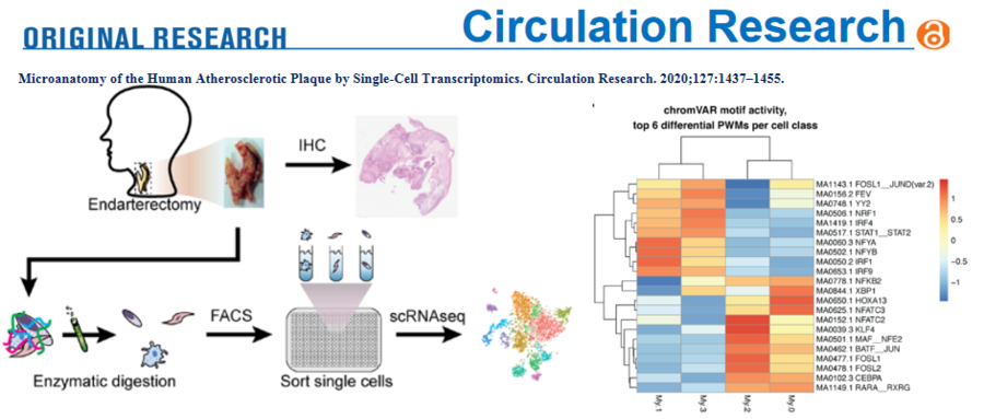 隨著單細(xì)胞測序技術(shù)的成熟,應(yīng)用領(lǐng)域越來越廣泛,引得無數(shù)科研人員聚焦于單細(xì)胞研究領(lǐng)域。早期單純的單細(xì)胞測序就可以發(fā)表不錯的高質(zhì)量文章,但目前大家都在爭相模仿很難做出新的亮點,提高文章檔次。這里我們不妨從多組學(xué)出發(fā),將單細(xì)胞結(jié)合空間轉(zhuǎn)錄組、ATAC、Hi-C、免疫組庫等多技術(shù)聯(lián)合分析,不僅可以使文章內(nèi)容更加豐富,還能從多種角度深層次挖掘疾病機理、生命活動過程,讓您的文章與眾不同創(chuàng)新高。今天給大家分享一篇發(fā)表在Circulation Research雜志利用單細(xì)胞ATAC-seq和單細(xì)胞RNA-seq技術(shù)探討人類動脈粥樣硬化斑塊的轉(zhuǎn)錄和表觀基因組特征,我們一起來看看文章整體研究思路。