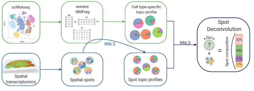 ?現(xiàn)在10x Visium數(shù)據(jù)基礎的分析思路是將每個spot看作一個細胞,然后參考單細胞轉錄組的分析思路進行分析。但是現(xiàn)在的實驗中,單個spot中包含不僅是一個細胞。如何確定每個spot中包含的細胞,對于空間轉錄組的分析是有幫助的。SPOTlight可以結合單細胞RNA測序信息反卷積空間數(shù)據(jù),識別每個spot中的細胞類型和比例。