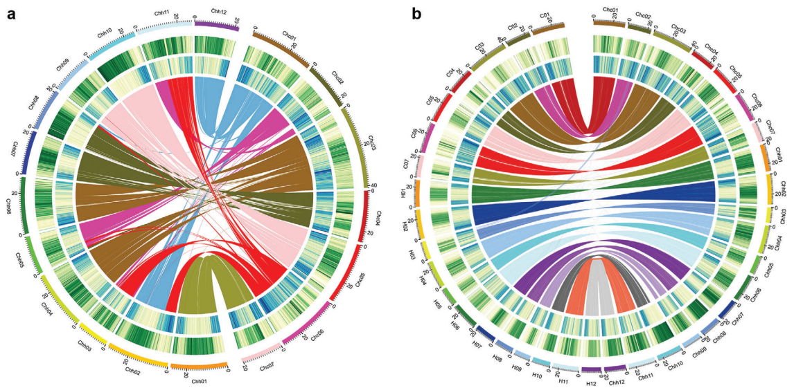作者通過PacBio+BioNano+Hi-C+Illumina共組裝獲得530.8?Mb基因組(≈67%流式評估大?。弧?7% survey評估大?。槐葘Πl(fā)現未裝出的為重復序列),contig N50=6.5?Mb,并將組裝的基因組序列掛載至19條假染色體上(掛載率97.23%;定序與定向率93.33%)(表1)。通過與二倍體C.sativus (CC)和C.hystrix(HH)染色體的C01–C07和H01–H12對應,將C.×hytivus染色體命名為Chc01–Chc07和Chh01–Chh12(圖1)。