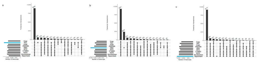 為了鑒定品種特異性轉(zhuǎn)錄本,以N22、IR64和Nipponbare三個(gè)品種的轉(zhuǎn)錄本作為blast比對(duì)庫,其它9個(gè)品種與其進(jìn)行比對(duì)(圖6)。識(shí)別到N22特有轉(zhuǎn)錄本652個(gè),IR64特有轉(zhuǎn)錄本2426個(gè),Nipponbare特有轉(zhuǎn)錄本349個(gè)。