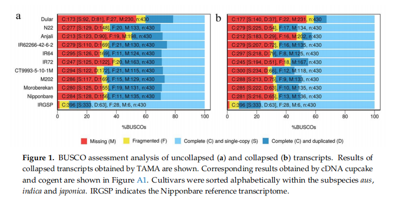 基于植物中430個(gè)高度保守的同源蛋白利用BUSCO軟件對(duì)TAMA算法去冗余前后的HQ進(jìn)行完整性評(píng)估(圖一),由于取樣不完全,缺失了54%~27%的重要蛋白,其中Nipponbare參考基因組(IRGSP)只缺失了6種。cDNA cupcake和TAMA的結(jié)果相似,而對(duì)于cogent,超過50%的蛋白缺失,最有可能的原因是轉(zhuǎn)錄本沒有回比到重建的基因組。