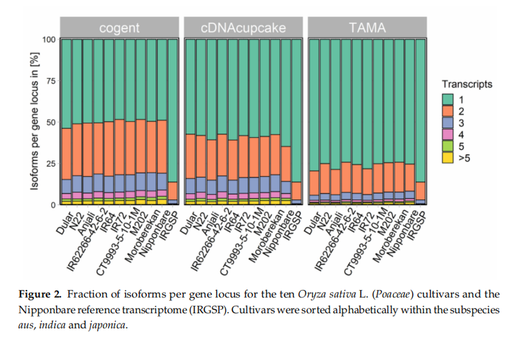 本文主要探討了Pacbio Iso-Seq獲得的轉(zhuǎn)錄本相比于Nipponbare參考基因組是否可以用于aus等水稻亞種的下游分析。此外通過這些轉(zhuǎn)錄本,我們希望發(fā)現(xiàn)水稻非生物脅迫下新的轉(zhuǎn)錄本和基因。我們的分析表明所有品種都可以鑒定出特異的轉(zhuǎn)錄本,還確定了aus亞種特異的差異表達(dá)基因。Pacbio Iso-Seq這種方法適用于其它沒有基因組或者基因組質(zhì)量不高的物種,相比對(duì)基因組組裝,這種方法更省時(shí)便宜。