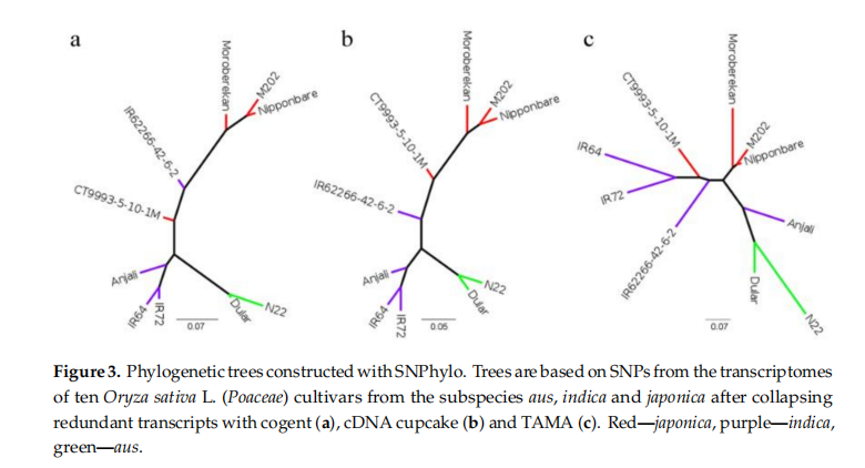 來自同一亞種的不同品種親緣關(guān)系更近,我們使用系統(tǒng)發(fā)育樹評(píng)估亞種之間的遺傳距離。利用去冗余后的轉(zhuǎn)錄本序列基于Nipponbare參考基因組識(shí)別SNPs,使用SNPhylo繪制進(jìn)化樹(圖3)。SNPhylo提取高質(zhì)量并且具有代表性的SNPs進(jìn)行后續(xù)分析,cDNA cupcake算法大約30000個(gè)SNPs,cogent算法大約23200個(gè)SNPs,TAMA算法大約16000個(gè)SNPs。三種方法中,同一亞種的不同品種聚類在了一起,cDNA cupcake算法和cogent的聚類結(jié)果更相似。三種方法均能將aus與另外兩個(gè)亞種區(qū)分開,但cogent和TAMA對(duì)indica和japonica種間的區(qū)分不如cDNA cupcake明顯。