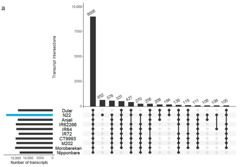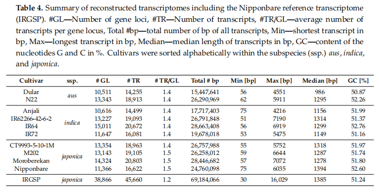 在過去的幾年里,RNA測序(特別是基于illumina的短序列RNA-seq)已經(jīng)成為分析轉(zhuǎn)錄組的有力工具,用來識(shí)別在非脅迫控制和各種環(huán)境脅迫條件下差異表達(dá)的基因。然而,需要基于參考基因組或轉(zhuǎn)錄組序列對(duì)RNA-seq數(shù)據(jù)進(jìn)行比對(duì)和注釋來確定轉(zhuǎn)錄水平。在水稻中,參考基因組決定了可以鑒別的差異表達(dá)基因和轉(zhuǎn)錄本亞型。顯然,參考基因組/轉(zhuǎn)錄組中沒有的基因的表達(dá)信息在分析過程中會(huì)丟失。這在研究耐脅迫的外來品種、陸地品種或野生稻種時(shí)尤其相關(guān),因?yàn)樗鼈兛赡芎袇⒖计贩NNipponbare不存在的耐受基因。這將嚴(yán)重限制識(shí)別支持作物改良計(jì)劃的新候選基因的可能性。