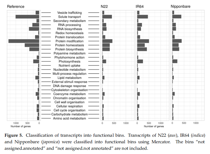 使用Trinotate和Mercator4進(jìn)行功能注釋。Mercator4是專門為植物開發(fā)的,它使用了一種簡單的層次樹結(jié)構(gòu),被稱為“容器”,用來描述生物學(xué)概念。主要的生物過程如光合作用,都是由頂層的容器來表示的,每個(gè)子容器描述的是一個(gè)更詳細(xì)的子過程。目前本體包括27個(gè)功能類別,代表了植物中不同的生物過程。N22、IR64和Nipponbare三個(gè)品種作為各自亞種的代表與植物中所有水稻基因的分類進(jìn)行比較分析,結(jié)果顯示三個(gè)品種的注釋結(jié)果分布相似(圖5)。超過28000個(gè)水稻已知基因在Mercator庫中沒有注釋分類信息,因此三個(gè)品種有8000~10000個(gè)轉(zhuǎn)錄本沒有分類注釋到Mercator庫。