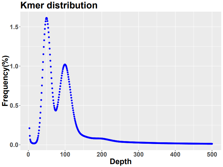 Figure 2一個二倍體的調(diào)研圖,橫軸是測序深度(覆蓋度),縱軸是k-mer出現(xiàn)的頻率,主峰位于100左右。