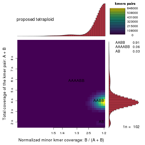 Smudgeplot通過尋找雜合k-mer來研究基因組的倍性,其定義的雜合k-mer對指的是一對k-mer之間只相差一個堿基,且沒有第三個k-mer與他們再相差一個堿基(如ATGATCA, ATGCTCA, ATGGTCA)。對于一個AB形式的雜合,smudgeplot試圖從所有k-mer中尋找一對雜合k-mer,而對于一個AAB形式的雜合,smudgeplot試圖尋找兩條相同的k-mer和一條它們的雜合k-mer,在圖中表示為更高的亮度。如下圖對一個四倍體的smudgeplot分析,可以明顯的看出AABB雜合模式附近的k-mer數(shù)量明顯高于其它k-mer,左上角也描述了這個結(jié)果。