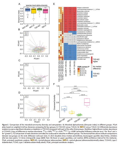1、四組中不同的腸道微生物組特征在我們的健康人群和新診斷出的?T2D腹部肥胖人群中,擬桿菌、厚壁菌門和變形菌門是所有組中主要的門。這些門占腸道微生物組成的?96%?以上,其他細菌的豐度要低得多(平均低于?4%)。與其他三組相比,T2D-NO組厚壁菌門的相對豐度較高(30%),擬桿菌門的豐度較低(62%)。然而,在四組之間在門水平上沒有觀察到顯著差異(例如,厚壁菌門?p = 0.17,擬桿菌門?p = 0.31,Kruskal-Wallis?檢驗)。在分類分析后?,對四組間的多樣性進行了比較。結(jié)果顯示盡管所有四組中的細菌集高度相似,但與其他三組相比,T2D-NO 組的豐度分布異于其他。更具體地說,在?T2D-NO?和?T2D-O?組(p = 0.012,PERMANOVA)(圖?2C)和?T2D-NO?和?NGT-O?組(p = 0.03,PERMANOVA)中差異顯著。NGT-NO?和?T2D-NO?組之間存在分離趨勢,但差異并不顯著(p = 0.108,PERMANOVA)。從?PCoA?中發(fā)現(xiàn)?NGT-O?和?T2D-O?組具有高度相似的整體腸道微生物群落特征(圖?2D)(p = 0.918,PERMANOVA)。在物種差異分析中發(fā)現(xiàn),盡管T2D-NO?和?NGT-NO?對照組沒有表現(xiàn)出顯著的群落水平差異,但發(fā)現(xiàn)兩個組之間的個體物種差異豐富(圖?2E),例如Akkermansia muciniphila ,Paraprevotella xylaniphila, Ruminococcaceae bacterium和Prevotella copri,,表明?T2D-NO?和?NGT-NO?組的特征在于某些微生物,而不是整個群落的巨大變化。4組的菌群共生網(wǎng)絡(luò)分析顯示NGT-O?網(wǎng)絡(luò)比?NGT-NO?對照組更小、更簡單,但比T2D-O?組更復(fù)雜(圖?2F)。對4組中菌群功能比較發(fā)現(xiàn),T2D-NO?個體的微生物群可能具有較低的碳水化合物利用能力和較高的BCAAs(支鏈氨基酸)?生產(chǎn)能力。此外,與?NGT-NO?微生物組相比,參與碳水化合物代謝(包括“半乳糖降解”)的?KEGG?模塊在?T2D-NO?中高度富集。