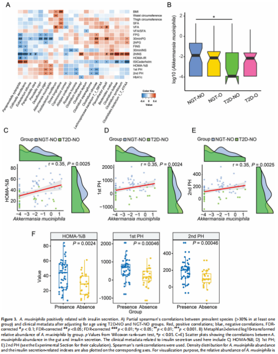 2、A. muciniphila?豐度在T2D-NO中減少并且與胰島素分泌呈正相關(guān)