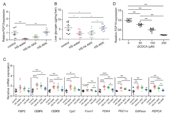 實驗結(jié)果表明,?A. muciniphila?治療顯著降低了 βCDCA?水平, 然而使用熱滅活的A. muciniphila并未導(dǎo)致βCDCA?水平顯著降低。這些結(jié)果與我們研究中觀察到的A. muciniphila豐度和βCDCA?水平之間的負相關(guān)一致。FGF19已被證明通過胰島素獨立途徑刺激糖原合成并抑制糖異生。臨床分析顯示,與NGT-NO組相比,T2D-NO組的血清FGF19水平顯著降低。FGF19水平與A. muciniphila在腸道菌群中的豐度呈正相關(guān),與βCDCA水平呈負相關(guān)。為了進一步研究βCDCA是否能抑制FGF15/19的表達,在CDCA存在的情況下,用不同濃度的βCDCA培養(yǎng)人結(jié)腸上皮細胞LS174T。我們發(fā)現(xiàn),CDCA聯(lián)合βCDCA處理LS174T細胞可導(dǎo)致FGF19 mRNA表達水平呈劑量依賴性下降,提示βCDCA對腸道FGF15/19表達有抑制作用。以上結(jié)果表明,A. muciniphila可能通過限制βCDCA的可用性,增強FGF15/19的表達,進而刺激糖原合成,抑制糖異生,至少部分抑制糖原合成。