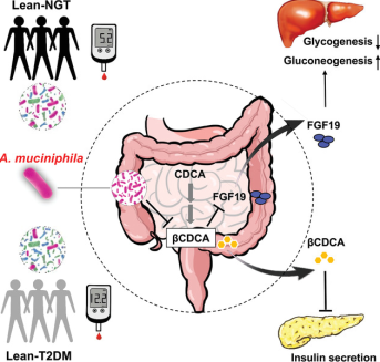 該研究比較了患有和不患有T2D的瘦人和腹部肥胖者的腸道微生物組,以確定腸道微生物組的差異是否能解釋患有T2D的瘦人的具體臨床特征。通過宏基因組學(xué)和代謝組學(xué)分析,發(fā)現(xiàn)在體型偏瘦的2型糖尿病患者中,腸道中A. muciniphila的豐度顯著下降,其豐度與膽汁酸βCDCA水平成負相關(guān),與該人群的胰島素分泌受損以及FGF19水平的下降密切相關(guān)。進而發(fā)現(xiàn),βCDCA能抑制胰島素分泌和FGF15/19表達。在高糖飲食誘導(dǎo)的胰島功能受損小鼠腸道中,A. muciniphila豐度顯著降低,而在補充A. muciniphila后,小鼠的胰島功能顯著改善,進一步研究發(fā)現(xiàn)A. muciniphila干預(yù)后βCDCA水平降低,腸道FGF15/19的表達上調(diào),肝糖原合成增加而糖異生減少。本研究提示A. muciniphila干預(yù)可能成為改善胰島素分泌和維持糖穩(wěn)態(tài)的潛在途徑,為2型糖尿病的治療提供了新方向。