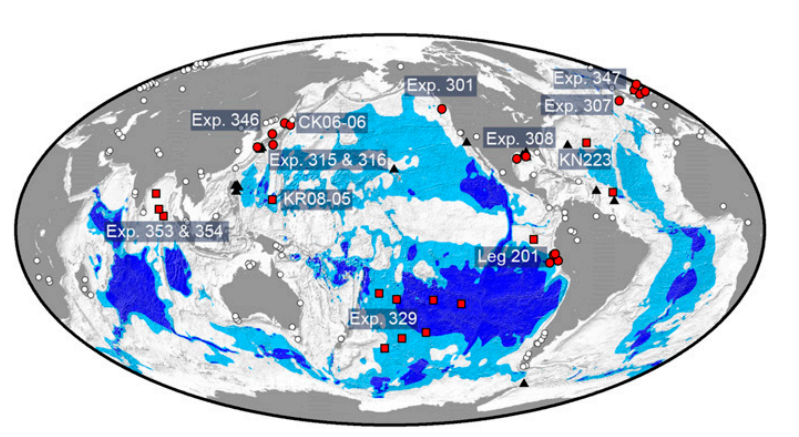 圖1 采樣地點的位置。紅色圓圈分別表示海洋邊緣站點,紅色方塊分別表示開放海洋站點。淺藍(lán)色和深藍(lán)色區(qū)域分別顯示整個沉積物中可能發(fā)生溶解氧和有氧活動的最大和最小區(qū)域。在14次科學(xué)考察中,從40個地點采集了海底以下許多不同深度的299個沉積物樣本,用于比較不同全球海底沉積物微生物群落組成。
