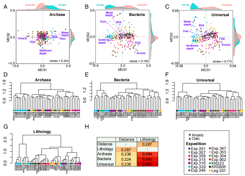 圖5 海洋沉積物微生物群落的β多樣性。(A–C)使用Jaccard相似性指數(shù)值生成的古菌(A),細(xì)菌(B)和通用引物數(shù)據(jù)集的NMDS排序圖。紫色箭頭表示與特征為P <0.01的環(huán)境因子相符的向量。(D–F)基于Jaccard相似性指數(shù)值,分別對40個地點的古菌(D),細(xì)菌(E)和通用引物數(shù)據(jù)集(F)進行算術(shù)平均(UPGMA)樹狀圖的非加權(quán)成對分組法。(G)基于40處沉積物的礦物成分的UPGMA巖性樹狀圖。(H)確定地理距離或巖性是否與微生物群落組成相關(guān)。