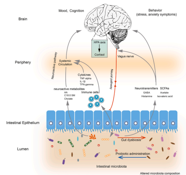 壓力在人們的生活中無處不在,嚴重的時候會引起人類焦慮甚至抑郁。目前抑郁影響著全球3億多人,每年有近80萬人因抑郁自殺身亡。最近的研究已經(jīng)證明壓力會擾亂人類腸道微生物菌群的平衡,進而導致焦慮、抑郁等心理疾病。人類和腸道微生物的基因組溝通進化,導致腸道、腸道神經(jīng)系統(tǒng)和中樞神經(jīng)系統(tǒng)之間存在復雜的互作。腸道菌群參與各種激素、神經(jīng)遞質(zhì)的合成、釋放,其紊亂會導致壓力、焦慮、抑郁、帕金森疾病和阿爾茲海默癥。人類需要維持腸道微生物菌群平衡,從而保證身體健康。足量的益生菌可以與腸道菌群相互作用,使宿主保持心理健康。在這個過程中,益生菌調(diào)節(jié)宿主的腸道微生物群落,及某些神經(jīng)活性化合物的合成、釋放。因此提出了基于益生菌治療某些神經(jīng)和神經(jīng)退行性疾病的療法。高質(zhì)量的人類和動物相關(guān)研究表明,腸道微生物群在許多與壓力相關(guān)的情況中發(fā)揮著重要作用。然而,腸道微生物組在壓力相關(guān)條件下的因果關(guān)系和貢獻程度尚不清楚,本文旨在從腸道微生物組的角度闡明這種機制。