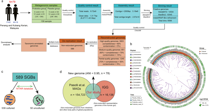 (a) 宏基因組組裝、分箱、構(gòu)建和去重復的流程中產(chǎn)生了總共 589 個高質(zhì)量SGB。(b) 589 個高質(zhì)量 SGB 的系統(tǒng)發(fā)育位置。樹的熱圖顯示了在實驗期間 SGB 的每千堿基讀取數(shù) (RPKM) 的 log2 倍變化。(c) 在 589 個 SGB 中,分別有 539 個和 50 個之前培養(yǎng)過和未培養(yǎng)過。(d) 78 個SGB的新穎性。通過與 IGG 數(shù)據(jù)庫(16,136 個非冗余代表性人類腸道基因組的集合)和 Pasolli ?et al.?MAGs 數(shù)據(jù)庫(來自全球人口腸道和其他身體部位的 154,723 個非冗余基因組的數(shù)據(jù)集)的交叉比較發(fā)現(xiàn)都不匹配?(<95% average nucleotide similarity)?。
