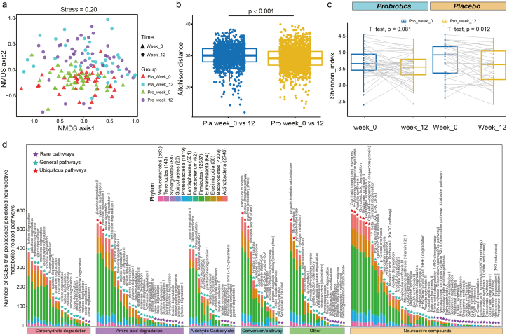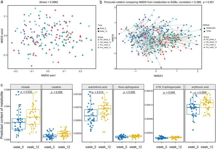 益生菌 (pro) 和安慰劑 (pla) 組在兩個時間點的預測腸道代謝組之間的差異。(a) 非度量多維標度(NMDS,Bray-Curtis 相似性指數(shù))和(b)對在第 0 周和第 12 周對兩組受試者的預測微生物組和代謝組進行了Procrustes 分析,表明顯示微生物組學和代謝組學特征之間的正協(xié)同性(correlation = 0.386;P??= 0.001)。(c) 益生菌組第 0 周和第 12 周之間預測的差異神經(jīng)活性代謝物。p 值經(jīng) FDR 法校正,閾值 P < 0.05 表示顯著。