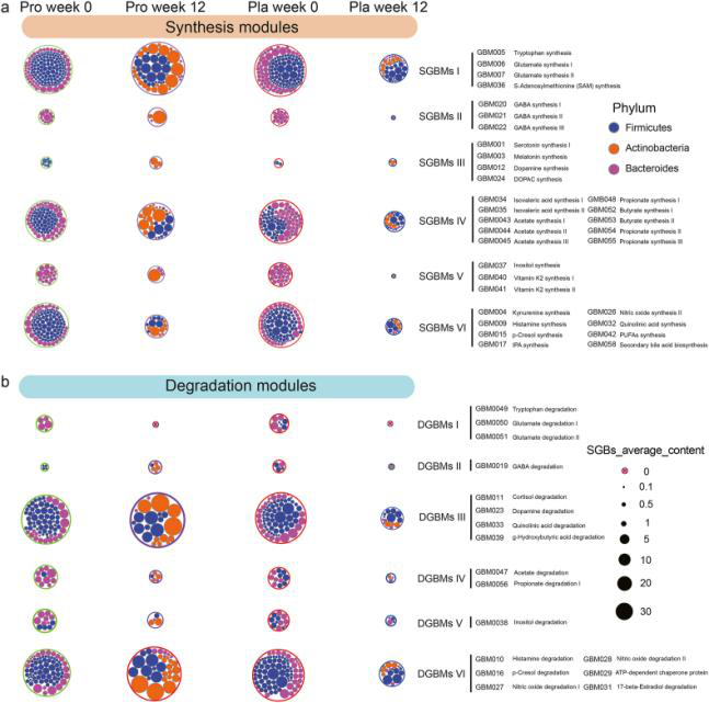 門級腸腦模塊 (GBM) 的分布。顯示了益生菌 (pro) 和安慰劑 (pla) 組中不同類型的 (a) 合成相關(guān)的GBM (SGBM) 和 (b) 降解相關(guān)的GBM (DGBM) 的分布及其在門水平上的組成。已鑒定的 SGBMs/DGBMs 根據(jù)其代謝物合成的預測功能分別分為六組(I 至 VI),并將它們相關(guān)的物種水平基因組箱(SGBs)分配給相應的門。外圈的大小代表相應 SGB 的平均豐度。