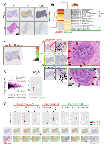 Visium分析發(fā)現(xiàn)了異質(zhì)基因表達(dá),這取決于癌區(qū)和非癌區(qū)細(xì)胞的位置。PgR表達(dá)下調(diào),盡管觀察到高ER表達(dá)(圖4a,上圖),與免疫染色結(jié)果一致(圖4a,下圖)。針對(duì)DCIS細(xì)胞中基因表達(dá)的變化,手動(dòng)選擇了188個(gè)位于導(dǎo)管內(nèi)區(qū)域的形態(tài)學(xué)斑點(diǎn)。這些斑點(diǎn)的無(wú)監(jiān)督分層聚類確定了三個(gè)明顯的聚類(圖4b,左面板)。在空間上,不同的簇對(duì)應(yīng)于不同的區(qū)域(圖4b,中間面板)。重要的是,簇1的48個(gè)斑點(diǎn)(紅色)與DCIS細(xì)胞的位置重疊,DCIS細(xì)胞根據(jù)其形態(tài)即將入侵(由圖4b右面板中的紅色箭頭指示)。同時(shí),簇2(有色綠色)的101個(gè)斑點(diǎn)位于同一導(dǎo)管的中心,并被視為不侵入基質(zhì)的細(xì)胞(由圖4B的中間板中的綠色斑點(diǎn)指示)。簇1和簇2之間的差異表達(dá)分析確定了2747個(gè)DEG(FDR<0.05,圖4c,左)。有趣的是,GATA3表達(dá)在簇1中顯著下調(diào)(圖4c,右圖)。盡管該基因未發(fā)生突變,但該患者的GATA3功能異??赡馨l(fā)生在基因水平。根據(jù)基因富集和通路分析的結(jié)果,該患者始終觀察到以GATA3為中心的基因表達(dá)變化,如患者A所觀察到的(圖4d,e)。共有21條途徑和18個(gè)癌癥特征,包括EMT和血管生成途徑受到影響。如對(duì)患者A所觀察到的,在未侵入間質(zhì)的第2組中,DEG主要代表雌激素反應(yīng)相關(guān)基因。總之,在這名患者身上,我們得出結(jié)論,GATA3通過(guò)其表達(dá)的變化發(fā)揮關(guān)鍵作用。即使沒(méi)有基因組突變,GATA3的異常表達(dá)也可能在某些患者中導(dǎo)致相同的結(jié)果。