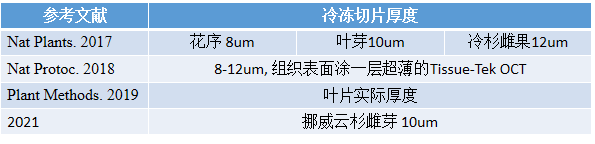 動物組織樣本細(xì)胞類型,結(jié)構(gòu)相對比較簡單,切片厚度比較統(tǒng)一,基本上保持在10μm厚度左右。但是植物樣本組織結(jié)構(gòu)復(fù)雜,而且木質(zhì)化程度不一,組織相對RNA含量較低,因此植物切片厚度一般根據(jù)樣本類型不同,選擇不同的切片厚度,一般植物冷凍切片厚度范圍為10-50um,根據(jù)物質(zhì)組織類型切片厚度會有所不同,視具體情況而定。