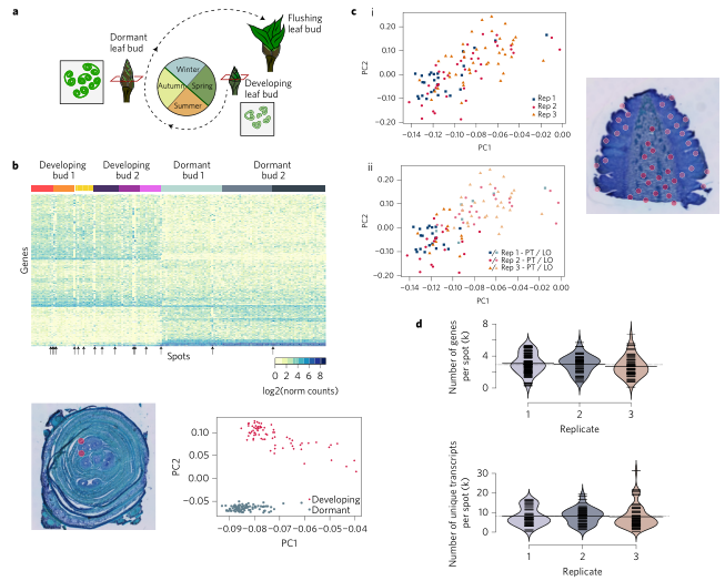 文中首先鑒定楊樹休眠期和發(fā)育期葉芽不同組織區(qū)域基因表達(dá)特征,證實(shí)了技術(shù)檢測的z確性、靈敏度以及重復(fù)性。休眠期(冬季)和發(fā)育期(夏季)葉芽一共檢測到17043個(gè)基因,樣本每個(gè)spot檢測到基因中位數(shù)為2929,轉(zhuǎn)錄本檢測中位數(shù)為8061,跟休眠期相比,在發(fā)育期葉芽中有408高表達(dá)的基因,在發(fā)育芽還是休眠芽組織切片中,高表達(dá)的基因在同一組切片之間和不同組的復(fù)制芽切片之間的表達(dá)模式清晰一致,無論生物學(xué)重復(fù)還是技術(shù)重復(fù)都證實(shí)該方法的重顯性和√確性。