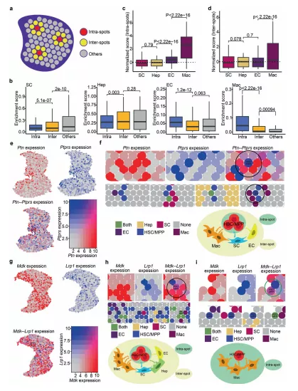 a點(diǎn)內(nèi)、點(diǎn)間及其他的示意圖。點(diǎn)內(nèi):HSC/MPP 定位點(diǎn);點(diǎn)間:HSC/MPP 包圍點(diǎn);其他,其他遠(yuǎn)端的點(diǎn)。b箱線圖展示點(diǎn)內(nèi)、點(diǎn)間和其他點(diǎn)中生態(tài)位細(xì)胞的富集分?jǐn)?shù)。c箱線圖展示了點(diǎn)內(nèi)生態(tài)位細(xì)胞的歸一化(富集)評分。d箱線圖顯示點(diǎn)間生態(tài)位細(xì)胞的歸一化(富集)評分。e FL中Ptn和Ptprs 的共表達(dá)模式。f 空間特征圖展示Ptn-Ptprs豐富的 HSC/MPP 擴(kuò)增單元?;騊tn在生態(tài)位細(xì)胞定位點(diǎn)(頂部,紅色點(diǎn))和基因Ptprs在HSC/MPP 定位點(diǎn)(頂部,藍(lán)色點(diǎn))的表達(dá)模式。g FL中Mdk和Lrp1 的共表達(dá)模式。h富含Mdk -Lrp1 的HSC/MPP 擴(kuò)增單元(點(diǎn)間)的空間特征圖。i空間特征圖展示富含Mdk- Lrp1 的HSC/MPP 擴(kuò)增單元(點(diǎn)內(nèi))。