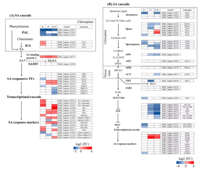 分析不同處理下,與JA和SA生物合成和反應(yīng)途徑相關(guān)的DEGs。發(fā)現(xiàn)了12個參與α-亞麻酸代謝和JA介導(dǎo)的信號通路的基因和4個參與苯丙氨酸和SA介導(dǎo)的信號通路的基因。JA和SA生物合成和反應(yīng)途徑的關(guān)鍵基因,如LOX2S、AOS、OPR、ACX、JMT、JAZ、PAL、NPR1、TGA和PR-1,表現(xiàn)出不同程度的上調(diào)或下調(diào)。