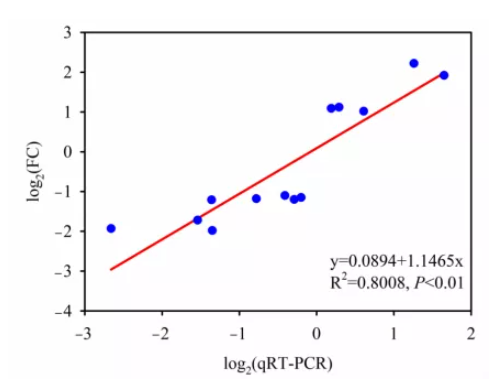 選擇了 13 個 DEG 進行 qRT-PCR 分析。線性回歸分析檢測到 qRT-PCR 和 RNA-seq 結(jié)果之間呈正相關(guān),相關(guān)系數(shù)為0.8。因此,本研究中的 RNA-seq 結(jié)果準確可靠。