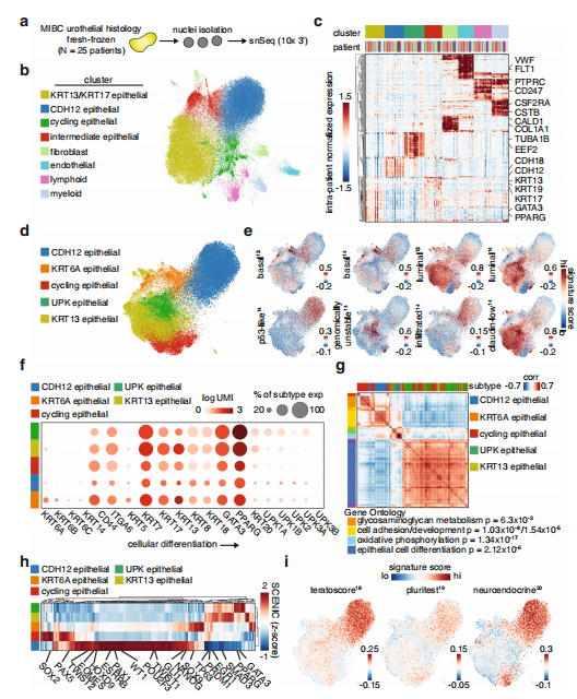 為了實(shí)現(xiàn)表征腫瘤內(nèi)異質(zhì)性的第一個(gè)目標(biāo),作者首先基于sn-RNAseq細(xì)胞類(lèi)型比例研究了MIBC腫瘤的總體細(xì)胞組成(圖1a)。腫瘤由約90%的上皮細(xì)胞、5%的免疫細(xì)胞、3%的成纖維細(xì)胞和2%的內(nèi)皮細(xì)胞組成,這些細(xì)胞根據(jù)相應(yīng)的角蛋白、PTPRC、膠原蛋白、PECAM1、VWF等關(guān)鍵標(biāo)記基因(圖1b)。上皮間室無(wú)監(jiān)督聚類(lèi)識(shí)別到了一個(gè)KRT13和KRT17差異表達(dá)的類(lèi)群,KRT13、uroplakins(UPK)、KRT6A細(xì)胞周期相關(guān)基因類(lèi)群,以及表達(dá)CDH12和其他上皮標(biāo)記物的細(xì)胞群(圖1d)。KRT13和UPK人群是僅有的兩個(gè)缺乏來(lái)自免疫浸潤(rùn)MIBC的基因標(biāo)記的人群,這表明在這些人群中富集的腫瘤代表免疫“冷”腫瘤(圖1e)。進(jìn)一步交叉參照傳統(tǒng)的尿上皮分化相關(guān)標(biāo)記表明,KRT13和UPK群體代表一個(gè)更分化的表型,而CDH12、KRT6A和cycle群體代表一個(gè)未分化或去分化的表型(圖1f)。如預(yù)期一樣KRT13和UPK群體表達(dá)了一個(gè)上皮細(xì)胞分化網(wǎng)絡(luò)(圖1g)?;趩渭?xì)胞調(diào)控網(wǎng)絡(luò)推斷和聚類(lèi)分析,預(yù)測(cè)CDH12群體表現(xiàn)出多種發(fā)育相關(guān)轉(zhuǎn)錄因子的高活性,包括NANOG、EOMES、PAX1和HOXD9(圖1h)。CDH12和循環(huán)群體在干-樣和神經(jīng)內(nèi)分泌基因標(biāo)簽得分也高(圖1i)。