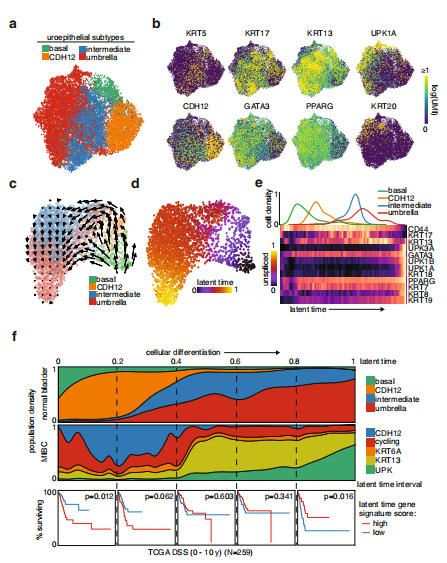 上皮細(xì)胞的無(wú)監(jiān)督聚類(lèi)分為基礎(chǔ)、過(guò)渡和傘部類(lèi)群(圖2a)。有趣的是CDH12群體與后一類(lèi)典型群體明顯不同,而過(guò)渡群體的KRT13和KRT17表達(dá)水平最高(圖2b)。確定了一個(gè)始于基礎(chǔ)細(xì)胞的軌跡,隨后分化為兩種途徑:一種貫穿CDH12群體,一種跳過(guò)CDH12群體(圖2c和d)。關(guān)鍵的尿上皮分化標(biāo)記物沿著這條路徑跟蹤,在起始階段CD44高表達(dá),隨后中間是KRT13和KRT17,終點(diǎn)站為UPK1A、GATA3、PPARG(圖2e)。所有4個(gè)正常樣本的擬時(shí)序分析顯示出相似的路徑,CDH12群位于起始點(diǎn)附近(圖2f)。為了確定CDH12腫瘤細(xì)胞與正常腫瘤細(xì)胞之間的轉(zhuǎn)錄相似性,并推斷它們?cè)谡I掀ぜ?xì)胞分化軌跡上的位置,作者使用表達(dá)相似性,確定了每個(gè)MIBC上皮細(xì)胞中最接近的正常細(xì)胞,然后給腫瘤細(xì)胞分配相應(yīng)的正常潛伏期(圖2f)。值得注意的是,最未分化表型對(duì)應(yīng)的間隔得分預(yù)測(cè)了較差的疾病特異性生存(DSS),而最分化表型對(duì)應(yīng)的間隔得分預(yù)測(cè)了較好的DSS,中間的間隔得分顯示了相反結(jié)果之間的過(guò)渡(圖2f)。