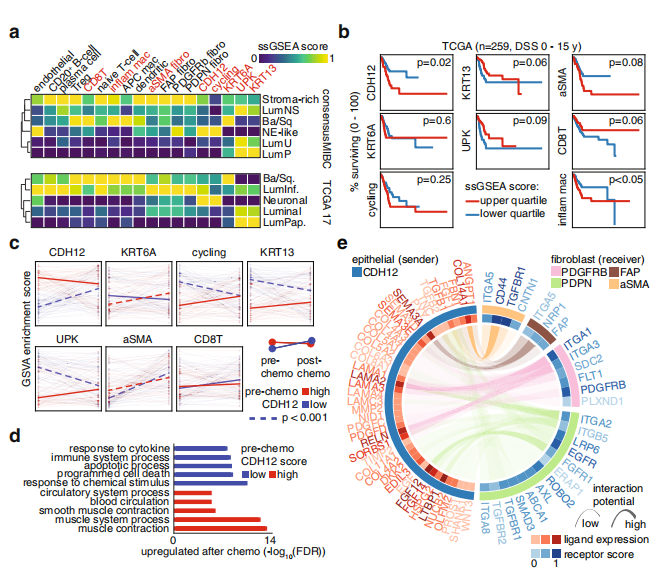 ? ? ? ? 有趣的是,在化療反應(yīng)中,CDH12評(píng)分較低的腫瘤細(xì)胞凋亡和免疫激活相關(guān)基因表達(dá)增加,而CDH12評(píng)分較低的腫瘤細(xì)胞表達(dá)增加CDH12評(píng)分通過(guò)纖維母細(xì)胞和內(nèi)皮細(xì)胞活化對(duì)化療有反應(yīng)(圖3d)。作者觀察到CDH12群體與成纖維細(xì)胞之間有許多顯著富集的相互作用,其中最顯著的是TGFBR1,CD44和一些整合素,因?yàn)樗鼈儏⑴c了癌癥相關(guān)成纖維細(xì)胞(CAF)的激活(圖3e)。