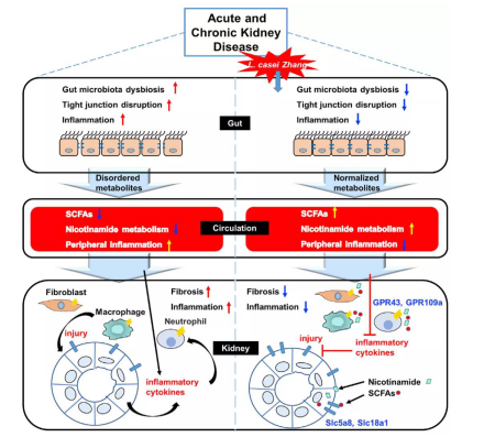 研究揭示干酪乳桿菌張(L.casei Zhang)可減緩急性和慢性腎臟疾病的進(jìn)展。首先研究人員探討了干酪乳桿菌張對(duì)腎臟損傷的影響。給缺血/再灌注(I/R)雄性小鼠損傷前后口服/不口服干酪乳桿菌,結(jié)果表明益生菌預(yù)處理后血清尿素氮(BUN)和肌酐值降低,腎臟的病理損傷降低,隨著時(shí)間的延長,表明使用益生菌干酪乳桿菌與較低的急性腎損傷和慢性腎纖維化密切相關(guān);隨后對(duì)小鼠糞便進(jìn)行微生物測序分析發(fā)現(xiàn),用干酪乳桿菌張預(yù)處理具有改善缺血/再灌注引起的生物失調(diào)、腸道炎癥和腸粘膜屏障損傷的能力;隨后研究人員探討了腸道菌群在腎損傷中的作用以及益生菌治療的效果是否依賴于原始腸道菌群,實(shí)驗(yàn)表明,在用廣譜抗生素(ABX)耗盡原始腸道菌群后,干酪乳桿菌仍有保護(hù)腎功能的作用,代謝組學(xué)分析顯示其升高有益代謝物SCFAs和煙酰胺,從而減少腎臟巨噬細(xì)胞和腎小管上皮細(xì)胞的炎癥反應(yīng),發(fā)揮腎臟保護(hù)作用;最后研究人員進(jìn)行了一項(xiàng)為期1年的口服干酪乳桿菌張的安慰劑對(duì)照研究,納入62例3-5期CKD患者,隨機(jī)分組到安慰劑或干酪乳桿菌張組,發(fā)現(xiàn)干酪乳桿菌張組的安全性良好,減緩了3-5期CKD患者的腎臟功能下降。