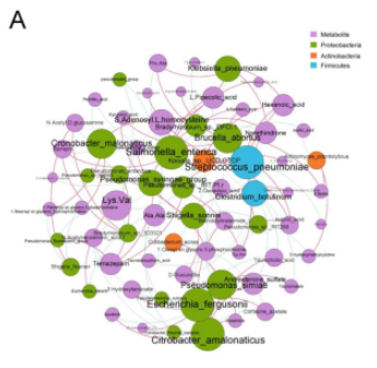 主要結果:慢性阻塞性肺疾病(COPD)是全球第三常見的死亡原因,表現為一種持續(xù)炎癥性肺部疾病,沒有根治方法。肺部微生物群促進了COPD的發(fā)展,但腸道微生物群的功能仍不清楚。在該研究中,研究者比較了COPD患者和健康對照組的糞便微生物組和代謝組,發(fā)現146種細菌在兩組之間存在差異。運用非靶向代謝組學鑒定出COPD的特征包括46%的脂質、20%的異型生物質和20%的氨基酸相關代謝物,通過相關性分析,構建了Streptococcus parasanguinis_B與COPD疾病相關代謝產物之間的相關網絡,COPD患者的糞便微生物組和代謝組與健康人不同,可能有助于尋找COPD的生物標志物。