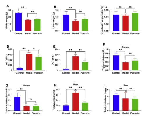 如圖1A-C所示,4周MCD喂養(yǎng)小鼠后,小鼠體重和肝臟體重顯著下降。葛根素治療可顯著減輕體重?fù)p失,但對肝臟重量沒有影響。但3個(gè)試驗(yàn)組的肝/體質(zhì)量比無顯著差異。ALT和AST通常用于評估肝細(xì)胞損傷。與對照組相比,NASH模型組血清ALT、AST活性顯著升高,TG、TC明顯降低。葛根素補(bǔ)充消除了血清中谷丙轉(zhuǎn)氨酶和谷草轉(zhuǎn)氨酶的升高,但對血清中TC和TG沒有影響(圖1D G)。在MCD飲食誘導(dǎo)的NASH小鼠中,觀察到肝臟TG含量顯著升高,而葛根素治療則阻止了這種積累。肝TC含量各組間無差異(圖1H I)。MCD飼料喂養(yǎng)的模型小鼠與正常小鼠相比,肝切片的H&E和 Oil Red O染色顯示,肝切片出現(xiàn)微泡和大泡性脂肪變性,并伴有炎癥細(xì)胞浸潤和肝細(xì)胞球化。