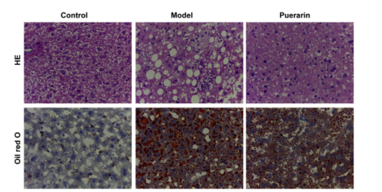 葛根素處理的小鼠表現(xiàn)出肝細(xì)胞中的脂肪沉積、炎癥和氣球樣變明顯減少(圖 2)。本文的結(jié)果表明葛根素可以對小鼠 MCD 飲食誘導(dǎo)的 NASH 的有益影響。