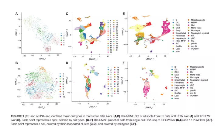 為了研究胎兒肝臟中免疫細(xì)胞和紅細(xì)胞的發(fā)育,作者利用ST技術(shù)分析了人類肝臟發(fā)育過程中基因表達(dá)的時(shí)空動(dòng)態(tài)。在篩選數(shù)據(jù)后,在8周PCW肝臟中檢測(cè)到1267個(gè)高質(zhì)量spots,平均每個(gè)spot包含204,628條reads,檢測(cè)到1,132個(gè)基因和5,924個(gè)UMIs。在17周PCW中,肝臟由3,489個(gè)單獨(dú)spots組成,平均78,576條reads,8,829個(gè)UMI,過濾后每個(gè)點(diǎn)檢測(cè)到2,266個(gè)基因。通過對(duì)每個(gè)ST陣列的spots進(jìn)行降維和聚類,根據(jù)基因表達(dá)模式在8周PCW肝臟(圖1A)和17周PCW肝臟(圖1B)中確定了6個(gè)和10個(gè)主要cluster。由于ST缺乏細(xì)胞分辨率,作者利用scRNA-seq技術(shù)研究了8周PCW和17周PCW活組織的基因表達(dá)異質(zhì)性。在應(yīng)用質(zhì)量控制過濾器和標(biāo)準(zhǔn)化后,scRNA序列數(shù)據(jù)分別25,186個(gè)細(xì)胞和9,153個(gè)細(xì)胞組成,每個(gè)細(xì)胞中有2,454和2,705個(gè)獨(dú)特表達(dá)的基因。為了探索活體器官的細(xì)胞組成,作者處理了單細(xì)胞數(shù)據(jù),并在8和17周PCW肝臟中鑒定了31和25種細(xì)胞狀態(tài),每種狀態(tài)都根據(jù)文獻(xiàn)中已知的標(biāo)記基因進(jìn)行了注釋(圖1C-F)。作者將這些cluster鑒定為B細(xì)胞、樹突狀細(xì)胞(DC)、DC1、DC2、早期成紅細(xì)胞、內(nèi)皮細(xì)胞、HSC_MPP、成纖維細(xì)胞、肝細(xì)胞、kuper、ILC、晚期成紅細(xì)胞、MEMP、肥大細(xì)胞、巨核細(xì)胞、中成紅細(xì)胞、單核細(xì)胞、中性粒細(xì)胞、NK、pDC、Pre、Pre-B、Pro-B和VCAM1+。