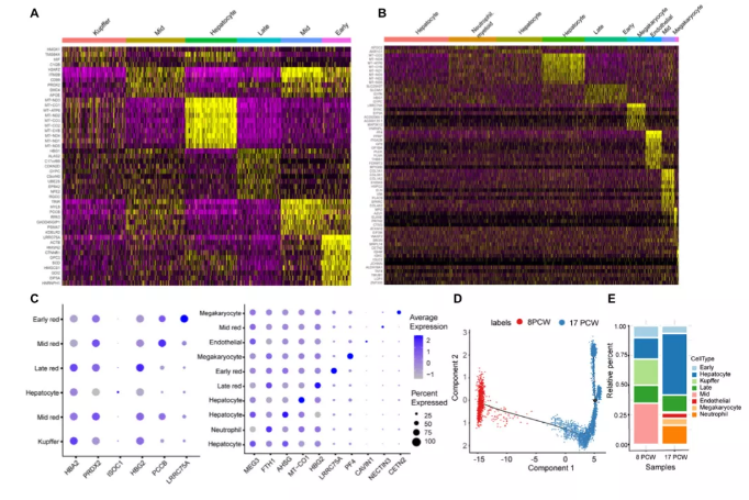 為了整合scRNA-seq和ST數(shù)據(jù)集,作者應(yīng)用了先前報(bào)道的Multimodal Intersection Analysis(MIA)進(jìn)行分析。通過MIA方法發(fā)現(xiàn)在跨空間區(qū)域識(shí)別細(xì)胞類型的消耗和富集方面是穩(wěn)健的(圖2A,B)。例如,作者發(fā)現(xiàn)肝細(xì)胞、kuper細(xì)胞、內(nèi)皮細(xì)胞和巨核細(xì)胞的高表達(dá)基因在ST和scRNA序列數(shù)據(jù)之間顯著重疊(圖2C)。8周 PCW肝臟由kuper、中成紅細(xì)胞、肝細(xì)胞、晚期成紅細(xì)胞、早期成紅細(xì)胞組成(圖2D)。17 周PCW肝臟由肝細(xì)胞、中性粒細(xì)胞、早期成紅細(xì)胞、中期成紅細(xì)胞、晚期成紅細(xì)胞、巨核細(xì)胞、內(nèi)皮細(xì)胞和巨核細(xì)胞組成(圖2E)。基于平均對(duì)數(shù)變化,每個(gè)cluster的前10個(gè)基因的熱圖顯示了cluster之間的高度異質(zhì)性(圖3A,B)。此外,作者在每種細(xì)胞類型中選擇一個(gè)最明顯的特征基因,并以點(diǎn)圖的形式呈現(xiàn)以比較差異(圖3C)。根據(jù)轉(zhuǎn)錄相似性,用單核細(xì)胞按預(yù)測(cè)的發(fā)育軌跡(擬時(shí)序)組織細(xì)胞。它產(chǎn)生了一個(gè)緊密相連的分化軌跡,分為兩個(gè)主要分支,分別對(duì)應(yīng)于不同時(shí)期的8和17 PCW(圖3D)
