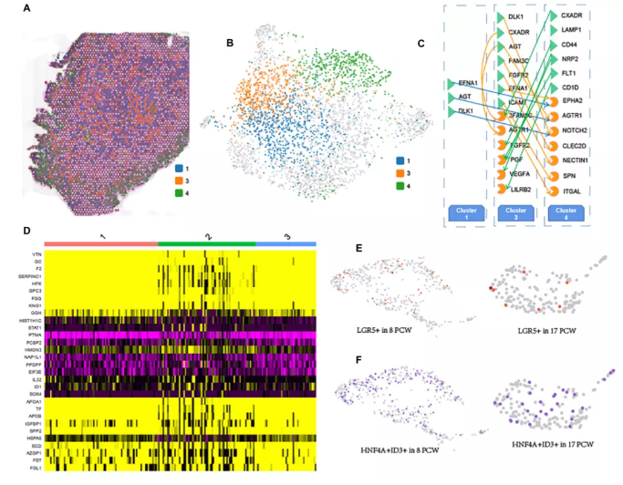 如圖3E所示,肝細(xì)胞是17 PCW肝臟的主要實(shí)質(zhì)細(xì)胞。作者觀察到三個(gè)不同的肝細(xì)胞cluster(cluster1、3和4)沿著17周PCW肝臟的空間深度分布(圖4A、B)。作者發(fā)現(xiàn)MEG3、ITIH3和HMGCS1呈cluster1高表達(dá)。FGB、IGFBP1和A2M基因在cluster3中表達(dá)更高,表明區(qū)域DEGs可能參與了相應(yīng)區(qū)域特異性功能的形成。此外,cluster4組中的肝細(xì)胞高表達(dá)數(shù)個(gè)基因,包括MT-CO1、MT-CO2、MT-CO3,它們參與線粒體電子傳遞和氧化磷酸化。值得注意的是,cluster1和3主要聚集在肝組織的中心區(qū)域,cluster4主要聚集在肝的周圍區(qū)域(圖4a)。差異表達(dá)分析的熱圖顯示肝細(xì)胞分化過程中逐漸下調(diào)或上調(diào)的基因。GO分析表明,1-3-4cluster中逐漸上調(diào)的基因主要與細(xì)胞極性通路、Wnt信號(hào)通路和GTPase活性的調(diào)節(jié)有關(guān),而逐漸下調(diào)的基因則參與壞死細(xì)胞死亡、糖原生物合成過程的調(diào)節(jié),肝臟再生。此外,作者描述了cluster1-3-4細(xì)胞之間的細(xì)胞通訊(圖4C),為將來的研究提供了潛在的信號(hào)轉(zhuǎn)導(dǎo)信息。值得注意的是,盡管cluster3和cluster1的距離更近,但cluster3與cluster4細(xì)胞的信號(hào)轉(zhuǎn)導(dǎo)比cluster1細(xì)胞更為顯著。此外,作者還發(fā)現(xiàn)了一些共享的和活躍的配體-受體對(duì),如DLK1-NOTCH2、EFNA1EPHA2、AGT-AGTR1,這些配體-受體對(duì)既存在于cluster1細(xì)胞與cluster4細(xì)胞的細(xì)胞通訊中,也存在于cluster3細(xì)胞與cluster4細(xì)胞的細(xì)胞通訊中。