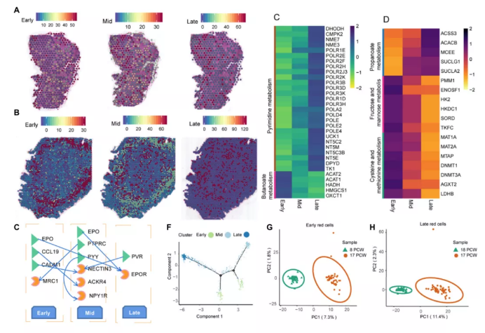 在8PCW肝臟中,小的紅細(xì)胞簇散布在整個(gè)肝臟中(圖5A)。在17PCW肝臟中,肝臟充滿了紅細(xì)胞,并且完全變紅(圖5b)。值得注意的是,早期的紅細(xì)胞位于肝組織的外圍,而中期紅細(xì)胞和晚期紅細(xì)胞則分散在肝組織的中心區(qū)域(圖5B)。這一戲劇性的形態(tài)學(xué)變化表明,在實(shí)驗(yàn)研究期間,人類胎兒肝臟都經(jīng)歷了血液的快速生長和遷移。在8和17PCW肝中均有早、中、晚期成紅細(xì)胞。為了研究紅細(xì)胞的發(fā)育過程,作者研究了這三種類型紅細(xì)胞間差異表達(dá)的基因。在8PCW肝臟中,818個(gè)基因在早、晚分化過程中逐漸下調(diào),2648個(gè)基因在早、晚分化過程中逐漸上調(diào)。逐漸上調(diào)的基因富含乙醛酸和二羧酸代謝、嘧啶代謝、果糖和甘露糖代謝、丙酮酸代謝和嘌呤代謝,而逐漸下調(diào)的基因與丁酸代謝相關(guān)(圖5C)。在17PCW肝組織中,有812個(gè)基因在分化早期、中晚期逐漸下調(diào),880個(gè)基因在分化早期、中晚期逐漸上調(diào)。