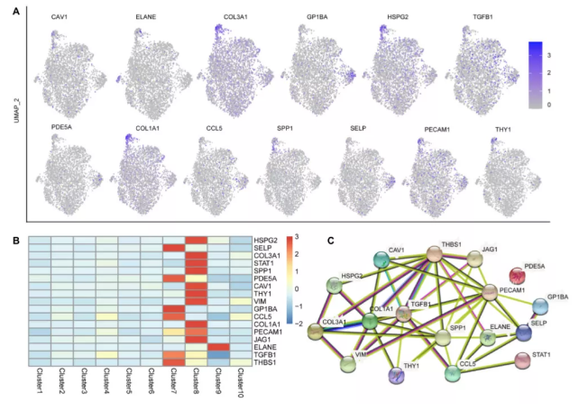 為了進(jìn)一步揭示這一現(xiàn)象,作者分析了這17種肝病相關(guān)基因在17PCW胚胎腎臟中的表達(dá)水平。除PECAM1外,其余基因在17PCW腎中表達(dá)。但其表達(dá)模式與肝臟不同,主要不在巨核細(xì)胞和內(nèi)皮細(xì)胞中表達(dá),說明這些肝病相關(guān)基因在胚胎肝臟中具有獨(dú)特的基因表達(dá)模式。此外,對(duì)這17個(gè)肝病相關(guān)基因的蛋白質(zhì)相互作用網(wǎng)絡(luò)分析顯示TGFB1、COL1A1、SPP1、PECAM1和THBS1在表達(dá)網(wǎng)絡(luò)中起關(guān)鍵作用,而PDE5A與其他基因沒有相互作用(圖6C)。