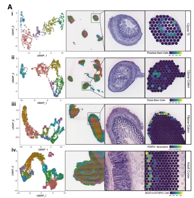注:左側(cè)圖為ST的各個(gè)簇(cluster)的UMAP展示;左側(cè)中間圖為 clusters 在空間組織上的聚類可視化展示;右側(cè)圖為 ST 與 scRNA-Seq 細(xì)胞類型注釋結(jié)果的整合