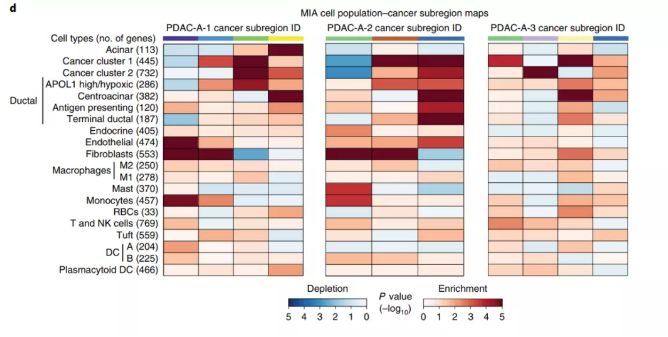 注:熱圖行表示個(gè)細(xì)胞類型,列為空間組織區(qū)域,紅色表示富集,藍(lán)色表示缺失