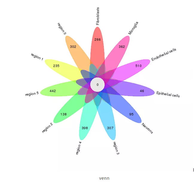 注:每個(gè)花瓣上的數(shù)字表示該細(xì)胞亞群或組織區(qū)域的差異基因總數(shù),中間圓心的數(shù)字表示所有細(xì)胞亞群與組織區(qū)域的交集基因數(shù)