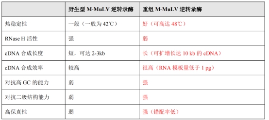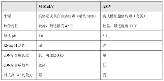 表1:野生型M-MuLV和野生型AMV兩種逆轉(zhuǎn)錄酶性能對比